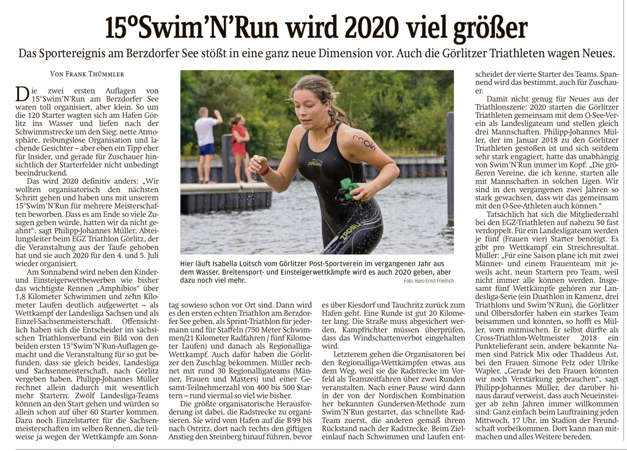Wie im SZ Beitrag zum 15°Swim’N’Run Görlitz zu lesen ist, plant das Team um Cheforganisator Philipp-Johannes Müller (EGZ Triathlon Görlitz) erstmals 2020 auch einen Triathlon. Der 15°Swim’N’Run findet am Samstag, den 04.07.20 bereits zum dritten Mal statt. Die Triathlon Premiere gibt es dann am Sonntag, den 05.07.20. Aber nicht nur das ist neu! Für die Saison 2020 planen der Verein EGZ Triathlon Görlitz und der O-SEE Sports e.V. ein gemeinsames STV Landesliga-Team. Dazu wird es bald eine ausführliche News geben. Alle Infos zum 15°Swim’N’Run Görlitz & Triathlon findet ihr hier und die Anmeldung ist hier möglich.
