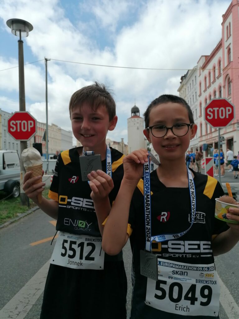 Am 9.6.2024 fand in Görlitz der 19.Europa Marathon statt und natürlich war auch O-SEE Sports e.V. vertreten. Bei besten Wetter trafen sich ca. 2.300 Sportler zu diesem Event in der Neiße Stadt. Von 400 m Bambini Lauf bis zur Marathon Distanz war für jeden Läufer was dabei. Um 10:20 Uhr erfolgte der Startschuss über die 5,6 km Strecke, was zugleich mit 663 Läufern das stärkste Feld war. Diese Herausforderung nahmen Erich und Jannek von den O-SEE X´Kids an. Mit einer tollen Leistung erkämpfte sich Erich in seiner AK U12 den 7.Platz (gesa. Pl.137) und Jannek kurz darauf den 10.Platz (ges. Pl.160). Die 1,5 km folgten auch unter starker O-SEE Beteiligung pünktlich 14:00 Uhr. In der AK U10 konnte Yannik sich den 3.Platz sichern und verpasste mit nur einer Sekunde den 2.Platz. Lisbeth erreichte einen starken 16.Platz sowie Karla Pl.55. In der U12 errang Mayla den 15.Pl. und Lotte den 50.Pl. Auch auf der 400m Bambini Strecke konnte ein X-Kids Mini punkten. Anouk erreichte einen sehr guten 2.Platz. Leider gab es für die Kleinsten keine Siegerehrung.