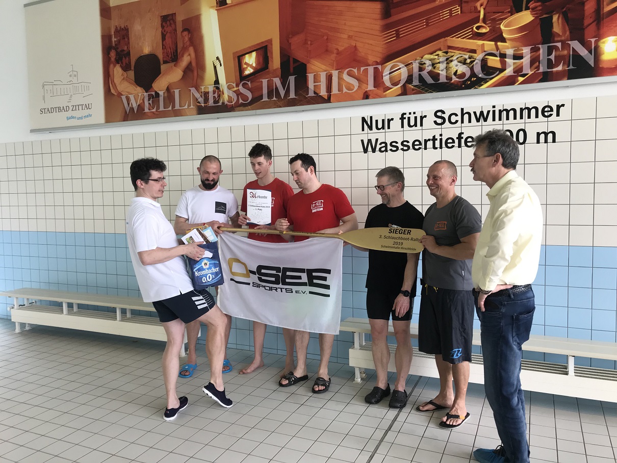 Am 9.März hieß es wieder: „An die Paddel, fertig, los!“ In der Schwimmhalle Hirschfelde wurde die 3.Schlauchbootrally ausgetragen und O-SEE Sports ging als Titelverteidiger ins Rennen. Die Veranstaltung bot in den letzten beiden Jahren immer einen hohen Unterhaltungsfaktor. Umso betrüblicher war es, dass insgesamt nur 3 Teams an den Start gingen. Vielleicht hätte man im Vorfeld doch etwas mehr die Werbetrommel rühren müssen… Neben unserem Team stellten sich noch 2 Teams vom Lokalmatador ISG Hirschfelde der Herausforderung. Drei Mal hieß der Wettkampfmodus jeder gegen jeden und am Ende zählten die meisten Siege. Das O-SEE Vorjahresteam ging fast unverändert an den Start und konnte alle Läufe erfolgreich für sich entscheiden. Damit war das Ergebnis eindeutig und die Titelverteidigung geglückt. Platz 2 belegte ISG 1 und Platz 3 ISG 2. So erfreulich es war, dass alle teilnehmenden Teams ein Platz auf dem Treppchen ergattern konnten, so sehr hoffen wir, dass nächstes Jahr wieder ein paar mehr Vereine bzw. Mannschaften um´s goldene Paddel kämpfen. Die Organisatoren und Veranstaltung hätten es verdient!