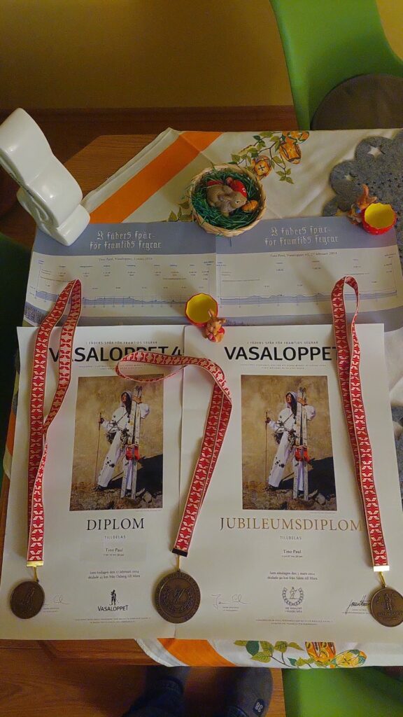 Freitag gab es einen 30 Km Nachlauf, da waren 2 Startplätze frei, die normalerweise Michael Urban und seiner Frau gehörten. Michael ist 2023 an der Gratzer Höhle tödlich verunglückt. „Komm Ronny wir fahren in Memorie für unseren Urb. Ganz gemütlich sozusagen als Trainingseinheit“. 1 Tag vor dem großen Wasalauf??? Ronald belegte gleich mal den 22.Platz von 1000 Läufern, hätte er sich noch ein bisschen mehr angestrengt, er hätte ihn vielleicht gewonnen? Ich hatte Platz 220 mit Stirnlampe im Nieselregen, es war eine wunderschöne Atmosphäre. Nach der Rückreise waren wir dann Sonnabend früh halb 3 nach mehreren Bieren und Schnäpsen im Bett.