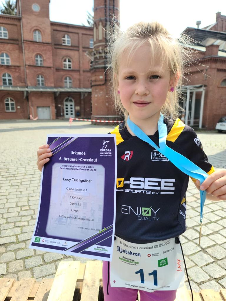 Unsere Lucy Teichgräber startete beim 6.Brauereicross in Görlitz auf der 2km Distanz. Pünktlich 10 Uhr fiel der Startschuss und ca. 30 laufbegeisterte Kids stürmten los. Lucy war voll motiviert und lief als Jüngste in einer Zeit von 7:45min die crossige Strecke. Kaputt aber stolz und glücklich kam sie als Siegerin in ihrer Altersklasse U8 (Platz 8 Mädchen gesamt) ins Ziel! Prima und weiter so!