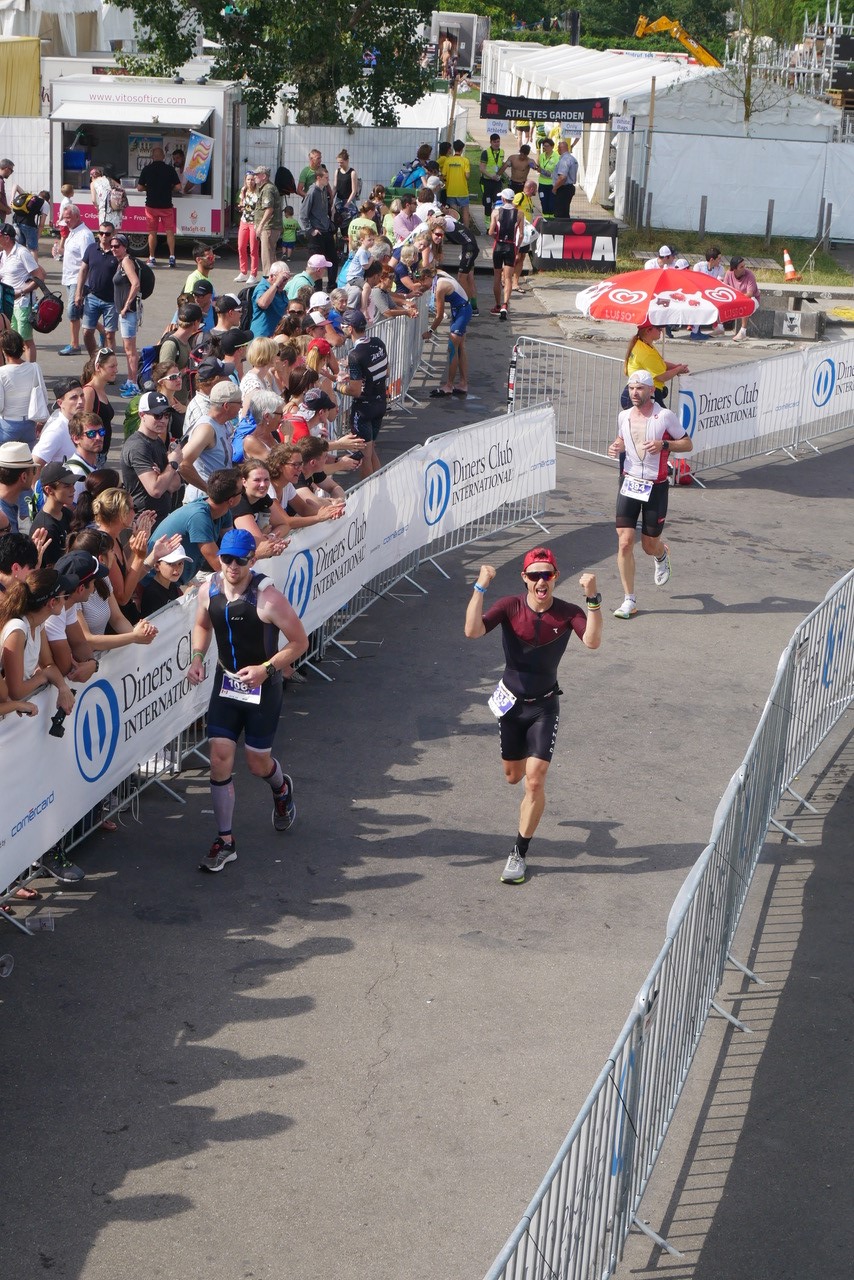 Der härteste Part dieses Tages stand mir aber noch bevor, der Marathon. Mittlerweile war es richtig warm. Der Wechsel klappte super und schon war ich auf Runde eins von vier. Die Strecke schlängelte sich am See entlang, durch die Altstadt, auf die gegenüberliegende Seeseite und wieder zurück. Hier merkte ich schnell, dass jetzt der Kampf richtig begonnen hat. Der Zahnarzt begann meinen Zahn langsam zu ziehen. Ich pendelte mich dann bei Kilometer 15 bei einer 5 Minuten Pace ein. Die nächsten Kilometer mal etwas drüber mal etwas drunter. Einer meiner besten Freunde war auch vor Ort und machte an vielen Stellen der Strecke richtig Lärm. Irgendwo, irgendwie entdeckte ich Ihn immer wieder, stehend, liegend, springend. Mit vollem Elan war Björni dabei und machte es mir damit auch leichter! Thx Diggie!