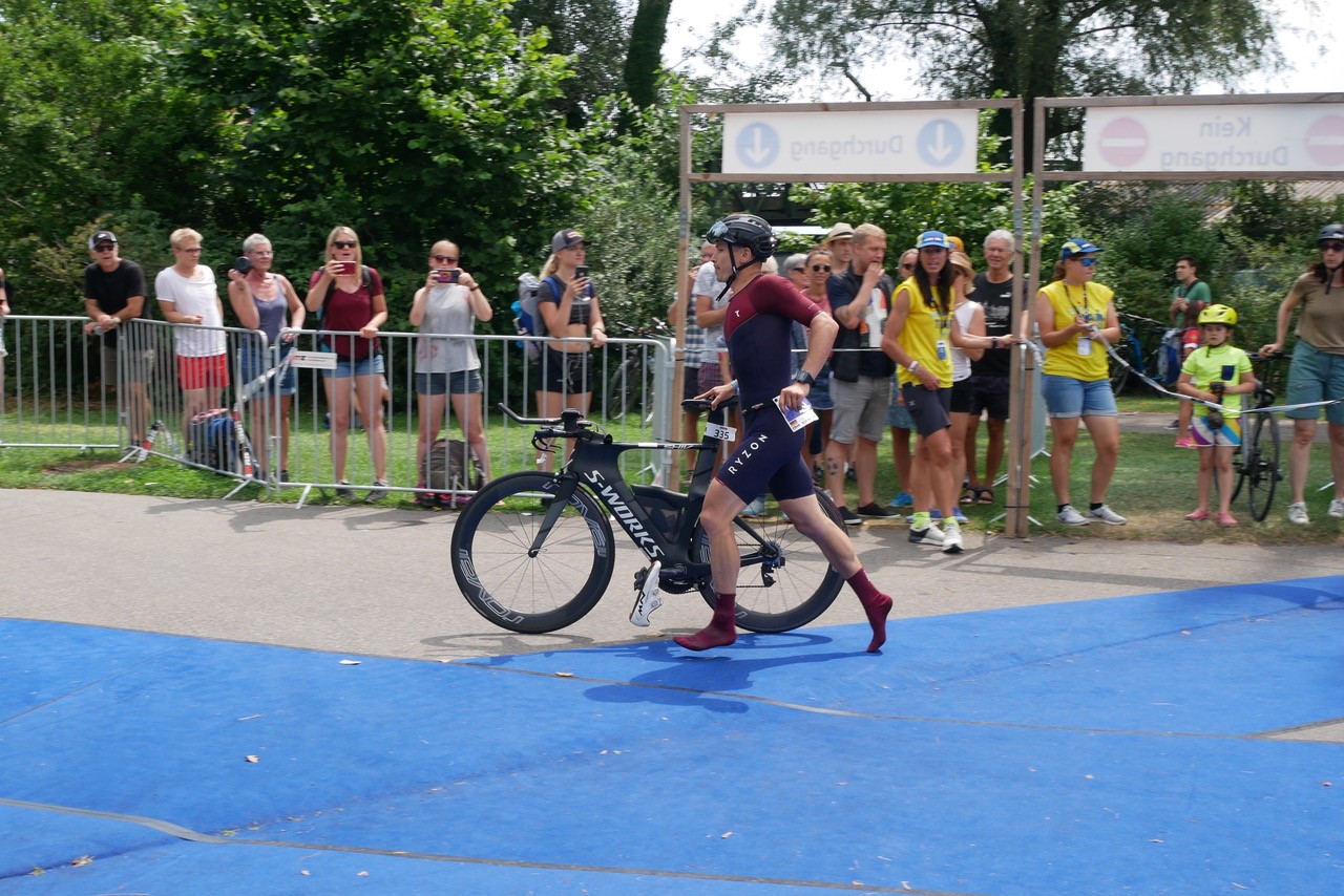Um 6:49:14 Uhr machte ich mich dann zum zweiten Mal auf den Weg, diesmal richtig wie es sich gehört. Ich habe ziemlich schnell meinen Rhythmus beim Schwimmen gefunden, das gelingt mir immer öfter und ist ungemein wichtig. Ich hatte das Gefühl anfangs viele Leute zu überholen. Das Wasser war sehr aufgewühlt, einerseits durch die vielen Athleten, andererseits aufgrund der Wetterlage. Wir schwammen ein großes T ins Wasser. Eine Runde a 3,8km. Zwei Mal hatte ich das Gefühl mein Transponder zu verlieren, sodass ich mich im Wasser zusammenrollte, um irgendwie zu checken ob ich das Ding gleich verliere. Kein schönes Gefühl. Ach bisschen locker schadet nicht, wie soll der über die Ferse rutschen, das passt schon und weiter. Da kam ein Athlet vorbei, der hatte definitiv den Delfin als Schwimmabzeichen, an den hängte ich mich eine Weile. Die Zeit verging zügig, immer wieder Bojen suchen und schauen nirgendwo in eine große Gruppe reinzugeraten war mein Plan. Das ging soweit auf, auch wenn es ab und an ordentlich auf und ab ging auf dem doch rauen Wasser. Bei ca. 57 Min merkte ich dann das ich damit auch nicht unter meiner geplanten Stunde bleiben werde, dafür war das erste Zwischenziel noch zu weit entfernt. Ich setzte bei 1:03:10h den Fuß auf die Wechselmatte. Ok für die Bedingungen, aber nicht überragend.