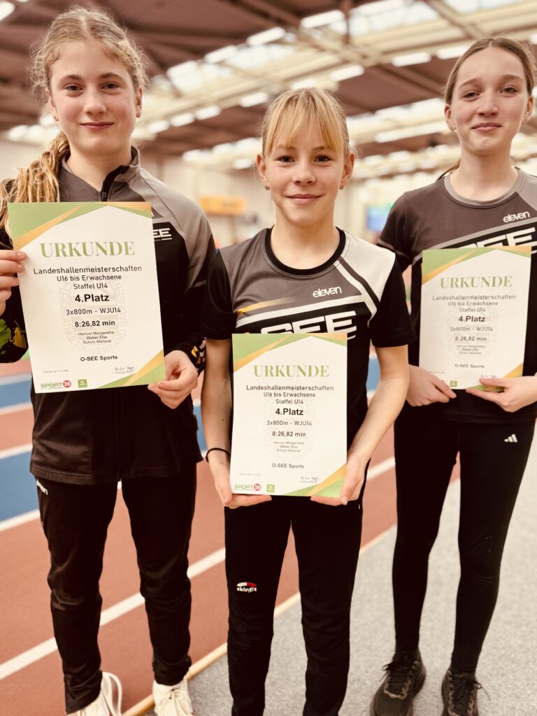 In der U14 war eine O-SEE Mädchen- und eine Jungs-Staffel über die 3x800m am Start. Wobei die Mädchen mit Margarethe, Ellie und Marlene den 4. und die Jungs mit Julius, Kay und Justus den 5. Platz belegten. Das vereinsinterne Battle „Mädchen gegen Jungs“ ging an die Jungs, die die schnellere Endzeit für sich verbuchen konnten (8:19 min zu 8:26 min), dafür hatten die Mädchen mit 14 weiteren Staffeln, die größere Konkurrenz.