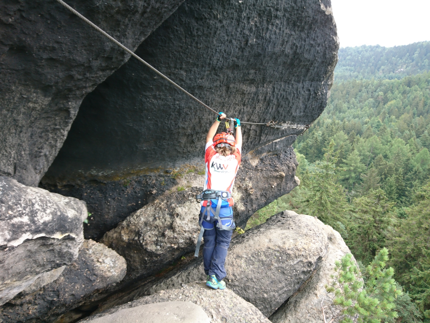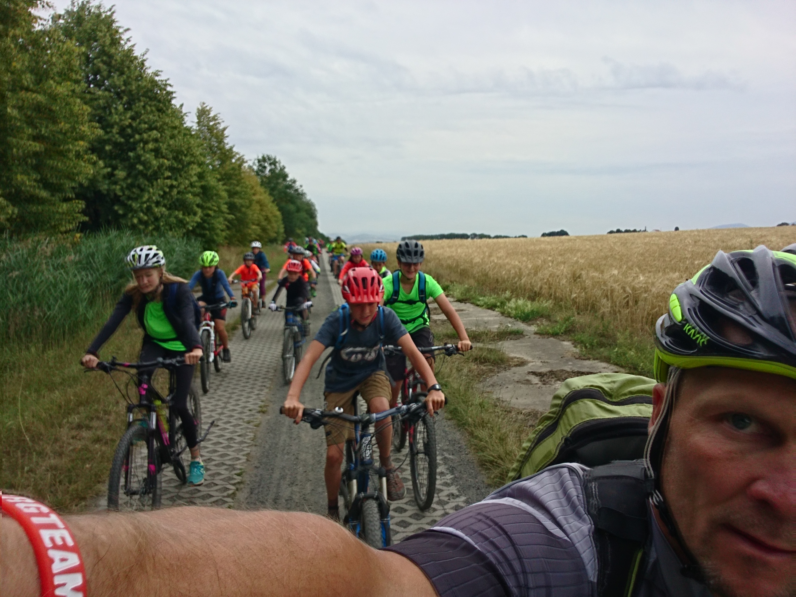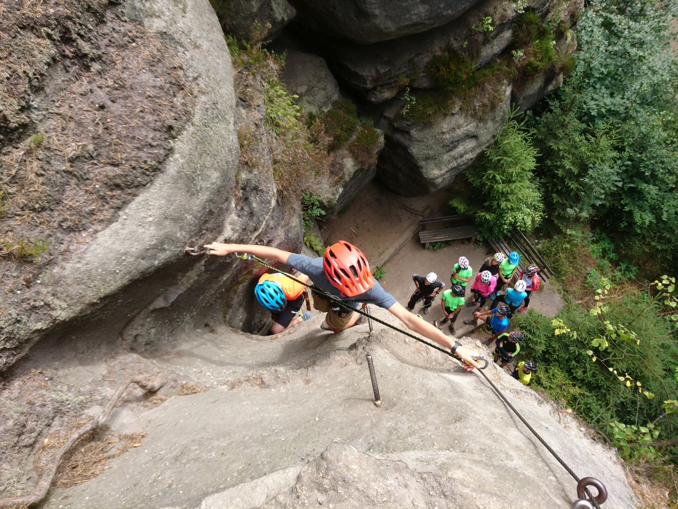 Montag ging das umfangreich Wochenprogramm mit einem Bike-Check durch die Fahrrad Fritzen los, danach war Laufen und Schwimmen angesagt. Dienstag stand eine Biketour zum Nonnenfelsen nach Jonsdorf auf dem Plan und anschließend das Erklimmen des Klettersteiges. Am Mittwochvormittag hieß es Koppeltraining mit Laufen und MTB am O-See, nachmittags ging es auf eine Biketour für die Großen ins Gebirge und für die Kleinen um den See mit dem Schwerpunkt Techniktraining.