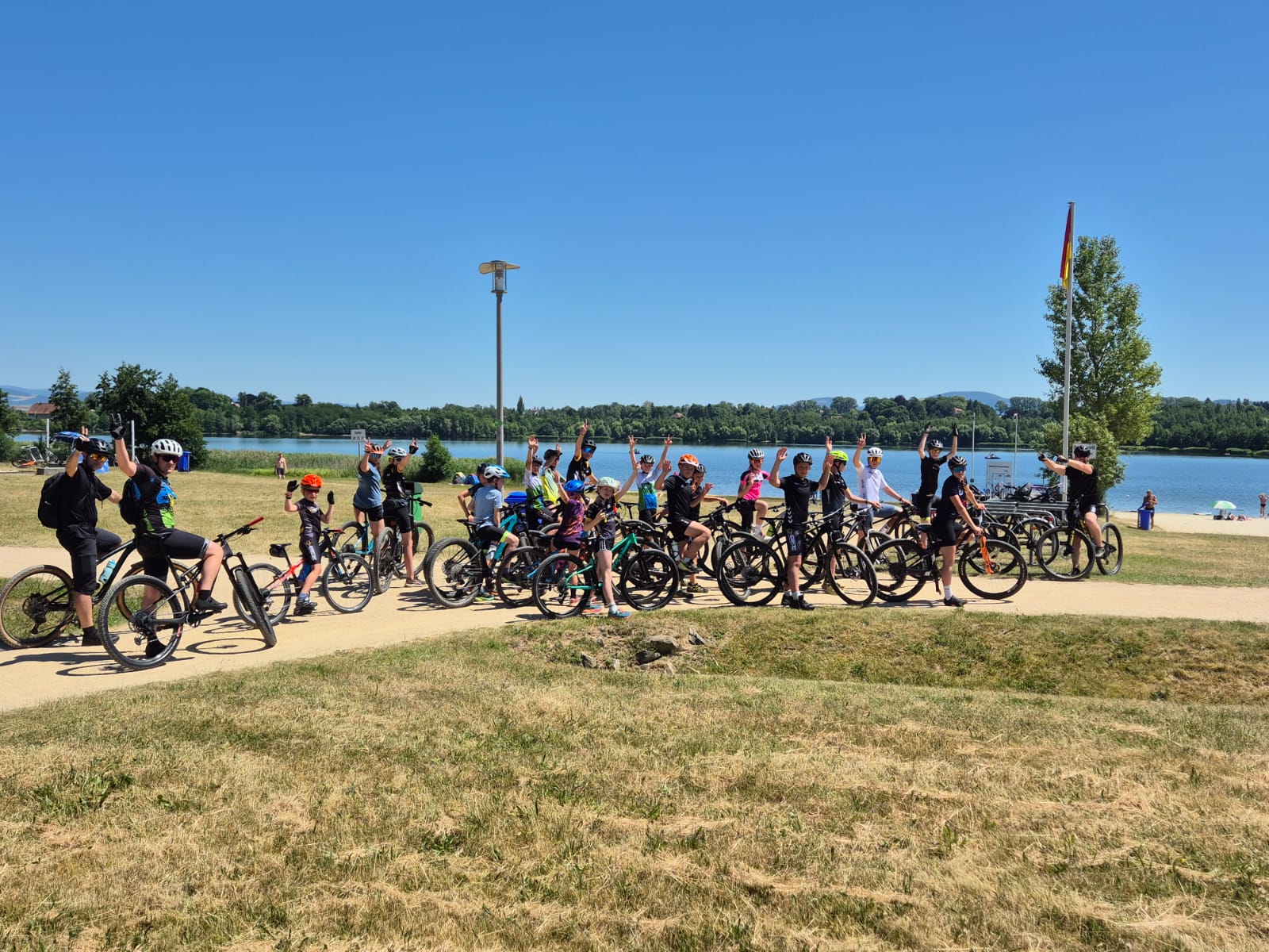 Im 5 Minuten Takt gingen die Mittleren und auch die Kleinen auf die Strecke bis schließlich alle Kids unterwegs waren. Pünktlich zum Start setze auch etwas Regen ein, aber das war bei der Hitze recht angenehm. Nachdem alle Kids erfolgreich und ohne größere Ausfälle wieder im Ziel waren, wurden Lose gezogen. So das die großen Kids /Trainer /Helfer jeweils ein 3er Team mit den kleineren bildeten, mitdem es um 15 Uhr wieder an die Startlinie ging. Die Durchfürung der Staffel erfolgte im Format von Jugend trainiert für Olympia: Der erste schwimmt, wechselt auf den Radfahrer, dieser wechselt auf den Läufer. Der Läufer läuft und schwimmt anschließend direkt um danach auf den Radfahrer zu wechseln der in der ersten Runde Schwimmer war und das immer so weiter bis jeder alle Disziplinen gemacht hat. Groß und Klein waren hoch motiviert und alle hatten viel Spaß. Der Tag endete mit der Siegerehrung und einem gemütlichen Grillabend.