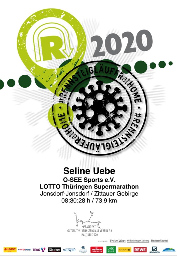 Seline Uebe vom O-SEE Sports e.V. hat beim virtuellen Rennsteiglauf einen Supermarathon über 73,9 km absolviert. Wie so viele Sportveranstaltungen musste auch der diesjährige Rennsteiglauf abgesagt werden. Der Rennsteiglauf gehört zu den kultigsten und größten Crossläufen Europas. Inmitten der wunderbaren mittelgebirgischen Landschaft des Thüringer Waldes, treffen sich Jahr für Jahr Mitte Mai um die 15.000 Laufverrückte.  Dieses Jahr wäre es die 48.Ausgabe gewesen. Damit die Läuferherzen nicht alle leer ausgehen, hat der Veranstalter kurzerhand eine virtuelle Ausgabe #RENNSTEIGLÄUFERatHOME verkündet.