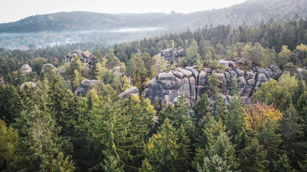Buntes Laub, Nebel, klitschige Wurzeln und Steine und skurrile Felsgebilde.