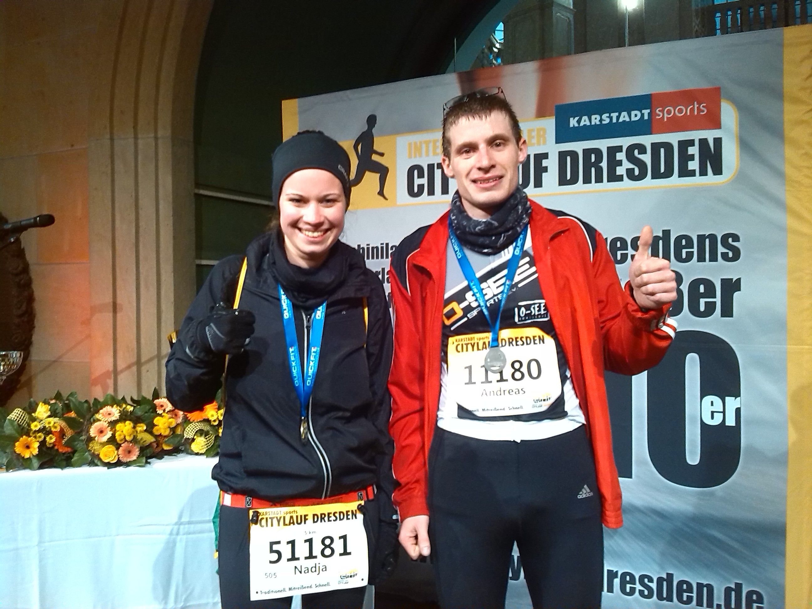 Hier noch ein kleiner Rückblick auf den bereits am 18. März stattgefundenen 27. Internationalen Karstadt sports Citylauf Dresden von Nadja: „…Bei eher mäßigem Wetter, es glich den Launen des Aprils, gingen zwei unserer Athleten beim Internationalen Karstadt Citylauf in Dresden an den Start. Nadja über die 5km-Distanz und Andreas über den Hauptlauf, den 10km. Der Rundkurs verlief durch Dresdens Altstadt, entlang des Altmarktes, Richtung Semperoper und am Elbufer unterhalb der Brühlschen Terrassen wieder zurück. Start/Ziel befand sich vor dem Rathaus. In einem knapp 2000 Mann starken Lauf absolvierte Andreas diesen Streckenverlauf zweimal, Nadja lief, in einem wesentlich beschaulicheren Starterfeld, einmal entlang einiger Sehenswürdigkeiten Dresdens. Die Zielzeiten der beiden fanden sich im Mittelfeld der Altersklassen W/M 20, sowie im vorderen Mittelfeld insgesamt wieder (allerdings legte Andreas ne flotte Sohle hin…eine 39:14 über 10km bei solchen Bedingungen verdient Respekt). Mit über 3300 Startern auf vier Distanzen konnte sich das Event sehen lassen. Der Elitelauf, an dem unter anderem die Hahner-Zwillinge Anna und Lisa Hahner an den Start gingen, war eines der Highlights, ein Hochzeitsantrag im Anschluss an den 5km-Lauf ein Weiteres (Ergebnisse Citylauf DD).