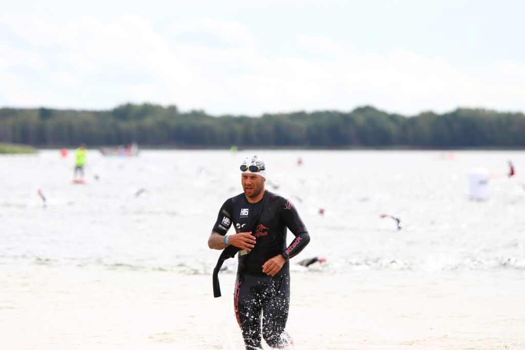 Alles wichtige Dinge, die man vorher nochmal abchecken sollte und auch ein wenig Zeit einplanen muss. 11 Uhr Start … der Schwimmstart erfolgt in dreißiger Wellen mit 1 minütigen Abständen und in Reihenfolge der Startnummern. Für mich hieß es nun erst mal weiter warten. 11:07 Uhr dann Start. Verdammt lange sieben Minuten. Das ganze Startprozedere nimmt natürlich etwas den Renncharakter, aber ich glaube es sind alle froh, dass dieses Rennen überhaupt stattfinden konnte und nahmen das gern hin. In meinem 30er Block habe ich mich nun ganz vorn rechts platziert und dann fiel der Startschuss für unser Grüppchen. Schnell konnte ich mich an die Spitze der Gruppe setzen und hatte leider keinen Schwimmschatten. Sonst versuche ich immer, mich an deutlich schnellere zu hängen um zu profitieren. Ging hier nicht … im Gegenteil. Immer wieder langsame Schwimmer, die wie aus dem Nichts auftauchen und natürlich ungewollt etwas tuschiert worden sind. Sorry, an der Stelle natürlich keine Absicht. Die 1,9km sind dann doch recht zügig verflogen weil sich das Umfeld ständig änderte. Ohne Landgang der Finish des Swims in 30:50min, ist in Anbetracht der Trainingsumstände sehr gut. Nun lag ein recht langer Weg zur Transitionzone vor mir, daher die lange erste Wechselzeit von knapp drei Minuten. So geil … bis hier hat alles reibungslos funktioniert.