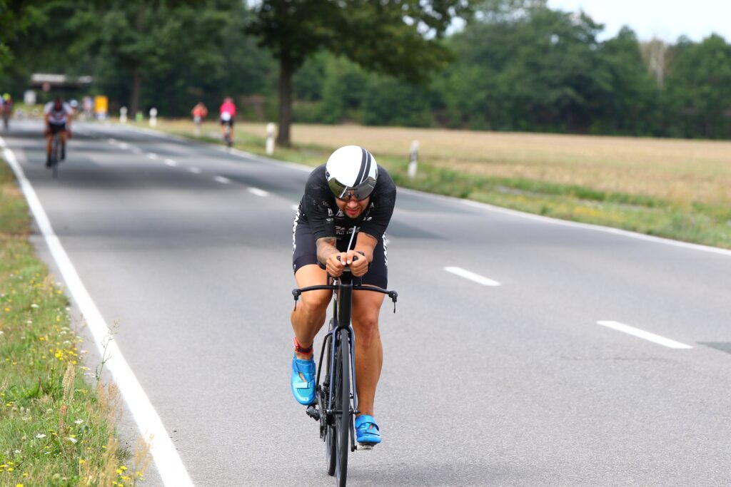 Aus dem Wechselgarten raus … aufspringen … Geschwindigkeit aufnehmen … Schuhe an … und drücke nicht zuviel. Ich hatte immer die Stimme von Coach Flo im Ohr … „Speisen und Reisen“ …. „überzieh nicht“ … „du musst noch laufen“ … „nen Halbmarathon“. Ich hab mich echt zusammen gerissen und Leute brutal an mir vorbei heizen lassen, wo man dann echt Disziplin zeigen muss. Später dann nach 60-70min bin ich in meiner 250 Watt Pace (39 Km/h Schnitt) schön ruhig an den Jungs vorbei gefahren und freute mich so etwas aufs Laufen, denn es lief toll. Nach 2:12h war der Bikepart, der in drei 30km Runden um den Scheibesee führte, abgespult.