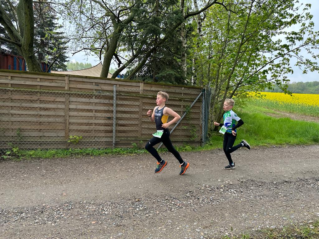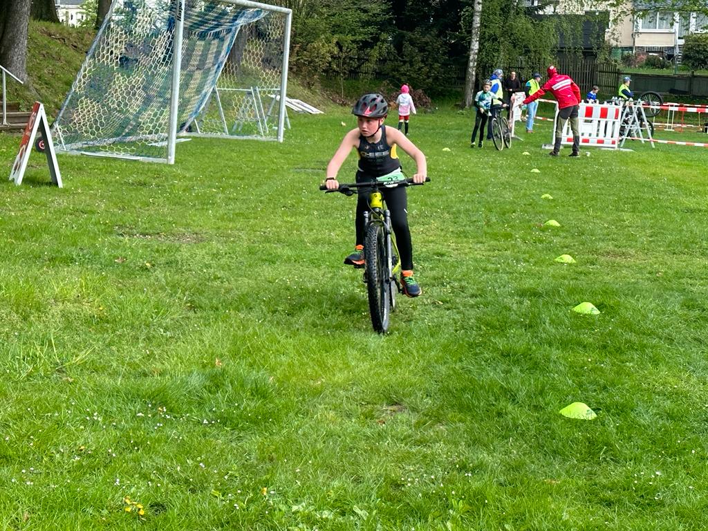 Tims zu absolvierender Wettkampf setzte sich aus einem 1 km langen Laufabschnitt, gefolgt von 2,5 km Radfahren und einer finalen 400m Laufrunde zusammen. Besonders interessant war ein Teil der Radstrecke, der eine doch recht anspruchsvolle Crossstrecke beinhaltete, welche den Kindern sowohl technisch als auch konditionell einiges abverlangte.