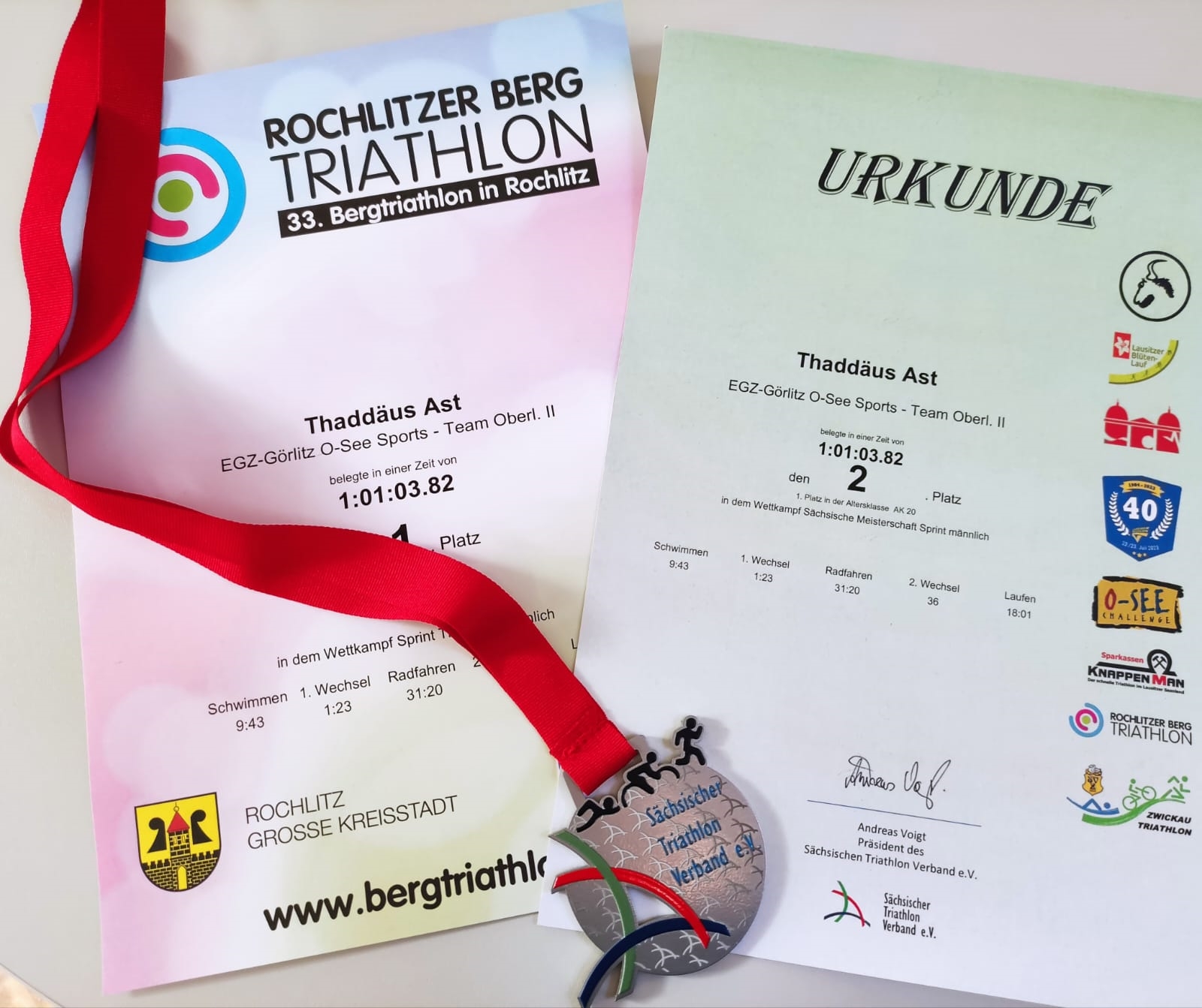 11:15 fand der geplante Start am Badesee Biesern statt und nach nur 09:43 min später kam schon Thaddäus aus dem Wasser. Dicht gefolgt von seiner Schwester Anastasia nach 10:20 min. Nun galt es die Höhenmeter der Radstrecke zu überwinden und Körner für die Laufstrecke zu sparen. Ironie in einem Satz! Thaddäus konnte seinen guten Start halten und mit einer Radzeit von 31:20 min ein klasse Tempo auf den Asphalt knallen! Die Laufstrecke über den Rochlitzer Berg konnte Ihm nichts anhaben und nach nur 1:01:03 konnte er ins Ziel laufen. Platz 5 Gesamt 1. AK und Platz 2 Sachsenmeisterschaft! Glückwunsch!