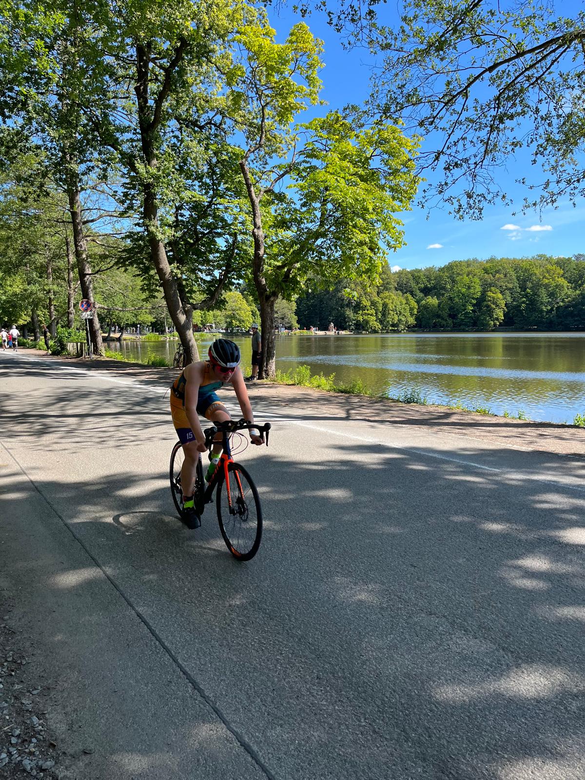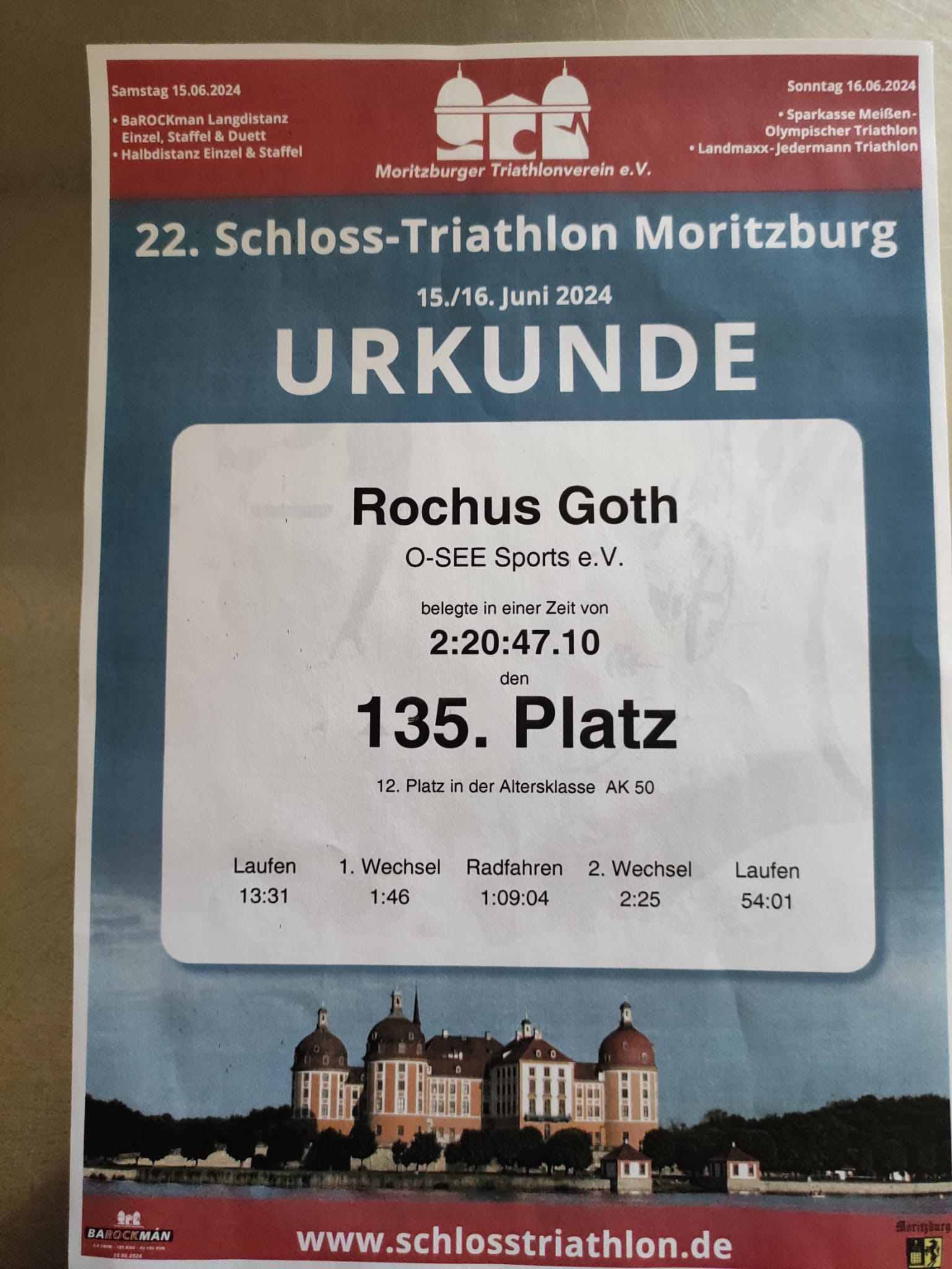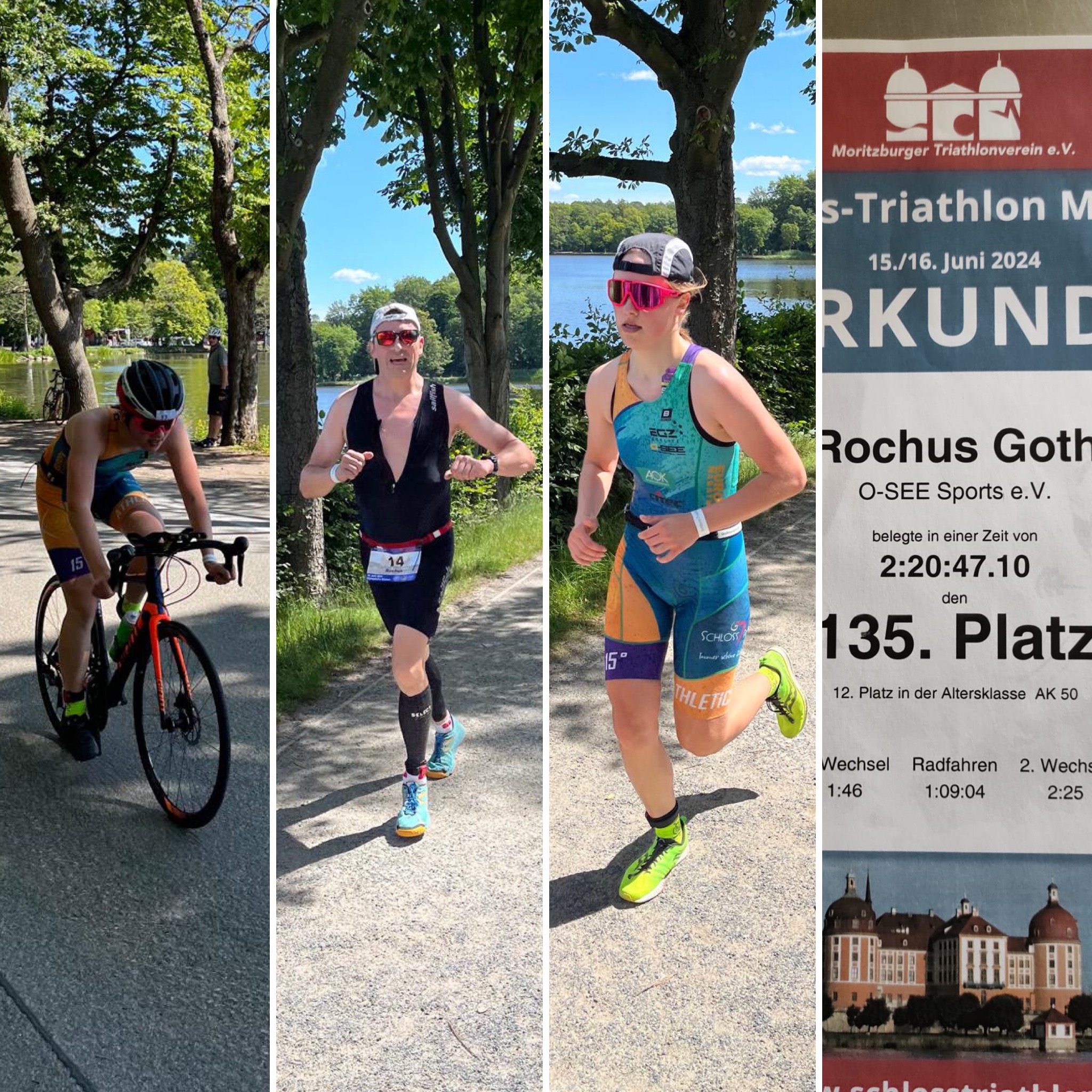 Traditionell starten, nach den Langdistanzen am Samstag, Sonntag die Athleten/innen über die Olympische und Sprint-Distanz. Darunter auch Anastasia Ast und Rochus Goth vom O-SEE Sports e.V. Beide gingen über die Olympische Distanz an den Start. Leider ebenfalls nur als Duathlon und ohne Schwimmen. Kleiner Nachteil für Anastasia, denn Schwimmen ist ihre Paradedisziplin seit Kindesbeinen an. Das sie überhaupt zum ersten Mal über die Olympische Distanz startete, lag am Verletzungspech ihres Bruders. Für ihn ist sie kurzfristig eingesprungen und hat seinen Startplatz übernommen. Im Gegensatz zum Vortag zeigten sich die Witterungsverhältnisse von der besseren Seite und es war nahezu feinstes Sommerwetter. Im Ziel angekommen, nach 2:27:50 h, konnte sich Anastasia über Platz 3 AK20 freuen. Rochus ging vor der Kulisse des Moritzburger Schlosses erneut über die Olympische Distanz an den Start und konnte mit 2:20:47 seine Zeit aus 2019 um fast 10 Minuten verbessern. Das reichte am Ende für Platz 12 in seiner AK50. Glückwunsch zu den Leistungen!