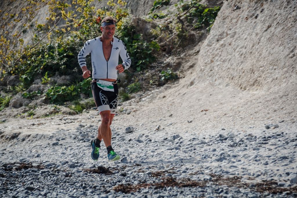 Mit dem guten Ergebnis im Gepäck ging es in den folgenden Tagen wieder zurück Richtung Dänemark auf die Ostseeinsel Møn. Austragungsort des XTERRA Denmark Rennens war das Geocenter, an der spektakulären Kalkstein-Steilküste Møns Klint. Nach den obligatorischen Streckentest an den Vortagen fiel am Sonntag, den 09.09., der Startschuss. Und es waren gleich zwei O-SEE-Starter dabei. Zu Patrick gesellte sich noch Bernd Kiesel. Beide stürzten sich 10 Uhr, unter kritischer Beobachtung der Robben, in die wellige Ostsee. Bernd konnte mit 27:30 min überzeugen. Patrick stieg erst 10 Minuten später aus dem Wasser. Im Unterschied zu den meisten anderen Wettkämpfen war der Wechsel aufs Rad deutlich anspruchsvoller. Um vom Meer die Steilküste hinauf zum Geocenter zu kommen, mussten 497 Holzstufen bezwungen werden. Also Neo aus, Laufschuhe an. Knapp 6-7 Minuten später war man in der Wechselzone. Ging erstaunlich easy. Noch! Die folgenden 30 Rad-Kilometer schlängelten sich unsere Athleten in zwei Runden durch einen offenen, sehr flowigen Wald mit einigen schönen Trails, aber auch kurzen knackigen Anstiegen. Auch wenn es auf der Strecke keine wirklichen Berge gibt, zerrte die zweite Runde schon ordentlich an den Kraftreserven. Hier hieß es nicht überpacen, um im abschließenden 10 km Lauf nicht einzubrechen. Dieser war in zwei unterschiedliche Runden aufgeteilt. Die ersten fordernden 5 km verliefen über einen Holzsteg bevor die Athleten in den Wald inklusive steilem Anstieg bogen. Hier hieß es mal wieder ‚gehen‘ statt laufen. Wer jetzt noch nicht fertig war, dem wurde auf der zweiten Runde, den letzten 5 km, der Zahn gezogen. Nach dem Holzsteg ging es allmählich runter in Richtung Küste. Für 2 km lief man direkt am Wasser entlang, auf faustgroßen runden Steinen. Ein Gefühl von rohen Eiern und müden Beinen machten diesen Abschnitt besonders tricky. Bloß nicht umknicken war die Devise. Denn zum krönenden Abschluss mussten sich unsere beiden O-SEE-Sportler noch einmal die 497 Holzstufen nach oben quälen. Was nach dem Schwimmen noch spielend leicht erschien, konnte jetzt nur noch mit größter Mühe bezwungen werden. Das war es dann aber auch und unsere beiden Athleten kamen mit super Ergebnissen ins Ziel. Ein forderndes Rennen, welches aber durch seine schönen, abwechslungsreichen Strecken und den guten Vibes im Zielbereich ein Tipp für die kommenden Jahre für unseren Verein sein kann.