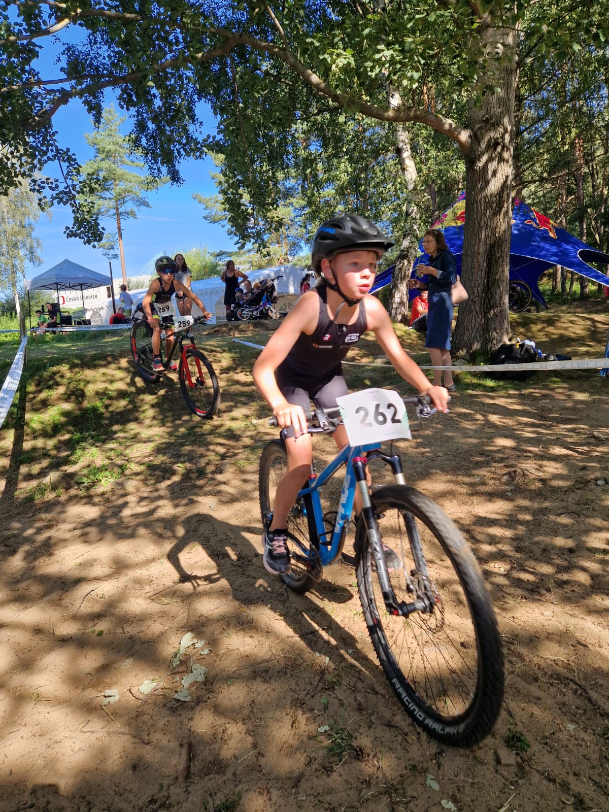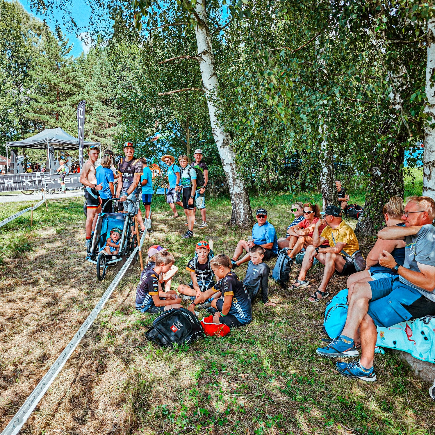 Nach dem alle Starter das Gelände verlassen haben, ging es für uns erstmal ins kühle Nass. Etwas Schwimmtraining wollten wir dann nicht ganz außer Acht lassen. Danach sind wir zur Streckenbesichtigung übergegangen. Nach der ersten Runde wurde uns klar, dass wird eine harte Nummer. Die Runde ist zwar kurz, dafür aber technisch sehr anspruchsvoll. Jedoch konnten sich die Kinder nach der 3. Übungsrunde so langsam damit anfreunden und sind auch immer sicherer geworden.